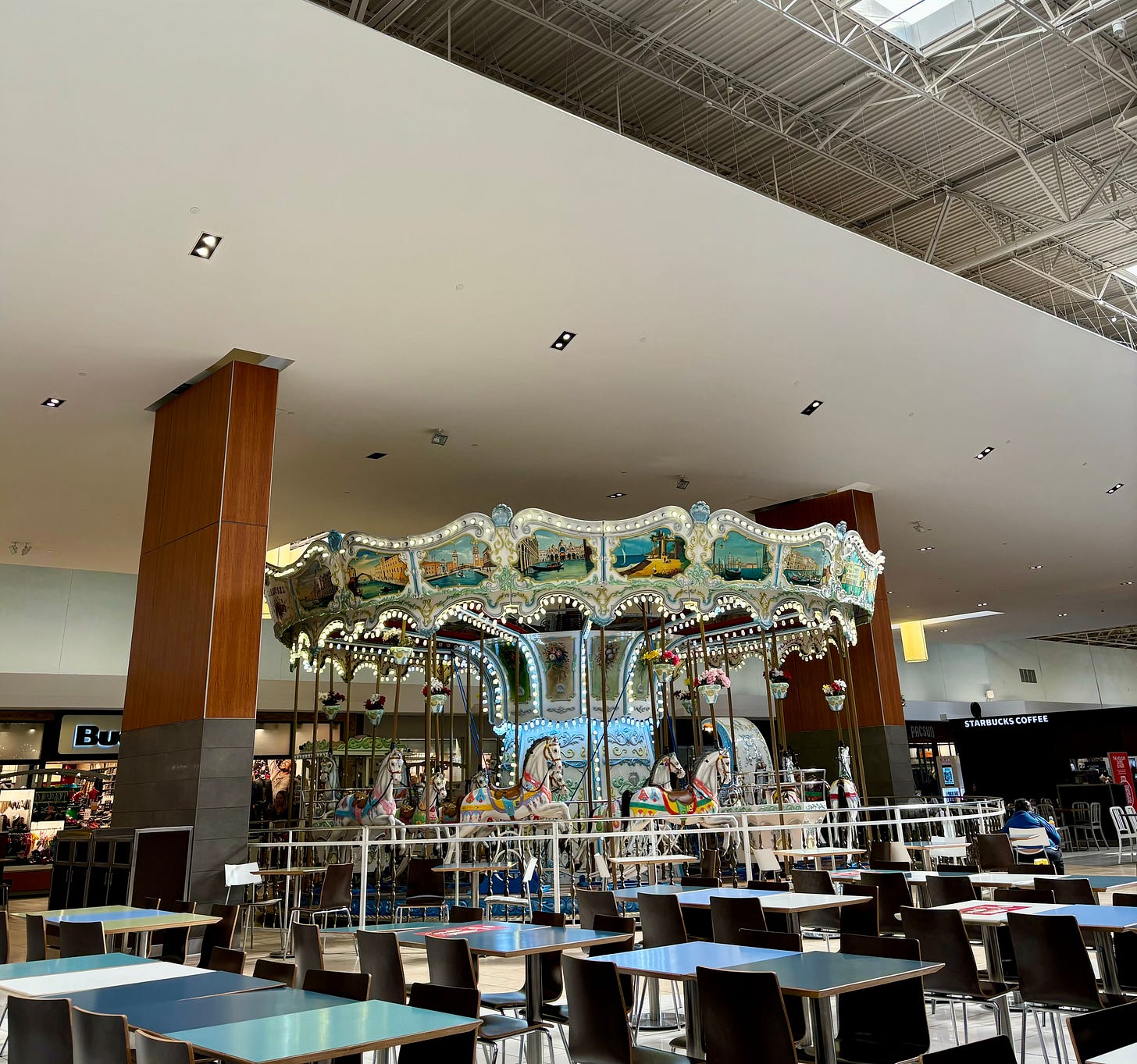 A bell sounds throughout the food court and the carousel takes its first ride.