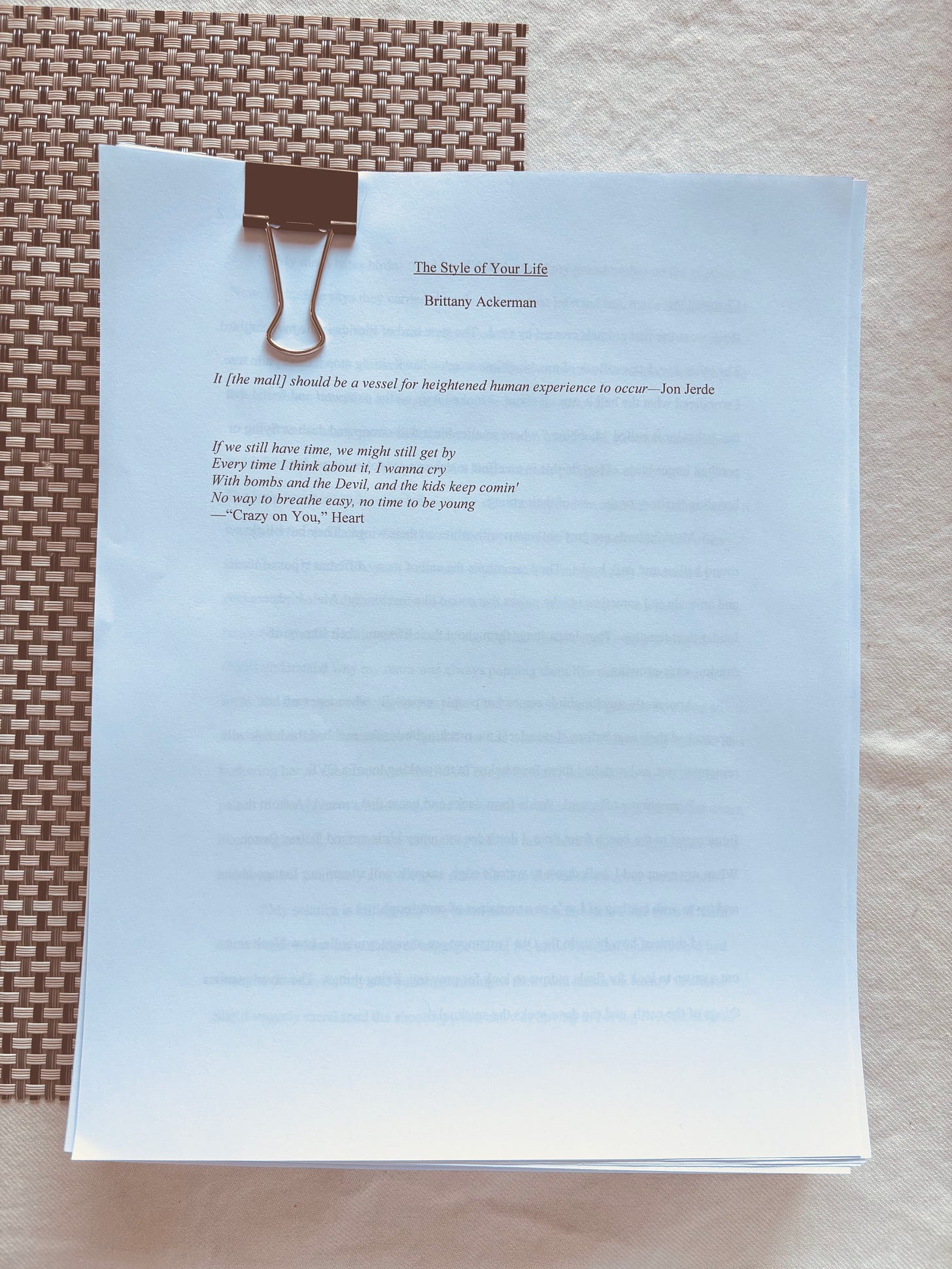 I told him stories about that summer: the customer who told my mom he was looking for his wife, and it turned out he came to the store because he thought he could purchase one; customers who tried to return used underwear without the tags and she had to let them because of company policy; the time she caught someone shoplifting and security tackled them and she got $500.00 for her services; the time a customer asked my mom to check out his ass in his pants; the time all the power went out in the store, or how I would unwrap hundreds of designer purses and steam evening gowns before they went out on the floor, or how on my breaks, I’d wander aimlessly, trying to reconnect to the rhythm of life, the fluorescent pulse of the mall. I walked in loops not to shop, but to feel like a person again.